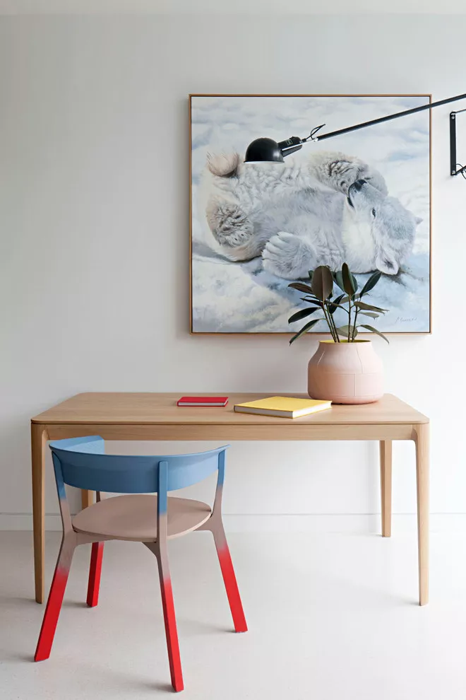 在北欧风里,大家也很喜欢小面积的对比鲜明的色块,来聚焦视觉重心。比如下图这把椅子,蓝粉红的色彩对比,使得空间色彩的更明快活泼。