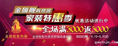 gavinjs散热器燕郊福成建材店优惠活动进行中,全场满3000返3000。(细则及更多活动详情请进店垂询当地代理商)